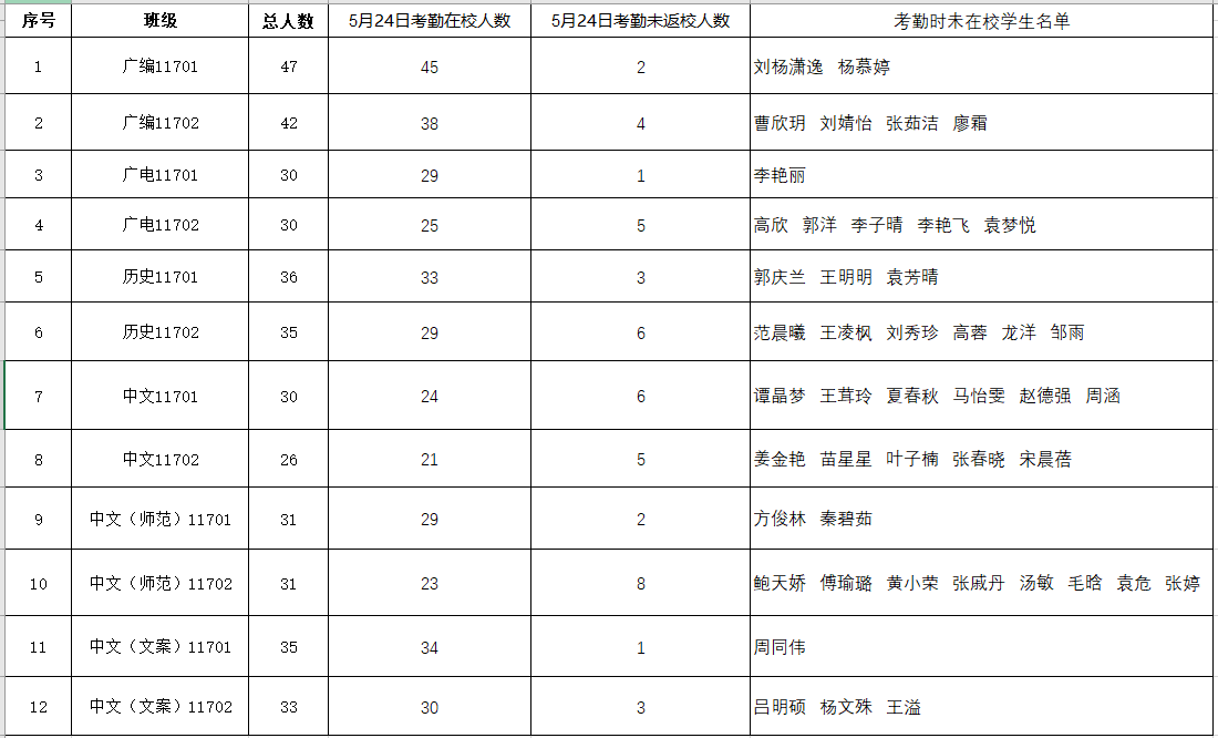 根据《关于加强毕业生毕业期间教育管理工作的通知》精神,现对5月24日2017级毕业生毕业期间在校考勤具体情况通报如下: