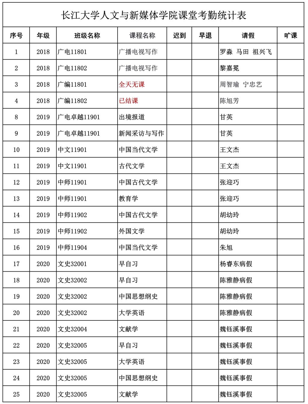 5月12日,公司组织员工干部对18、19、20级30个班的23门课程进行67次课堂考勤,100%到课率42次,现将考勤结果公布如下: