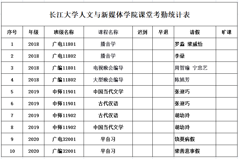 5月11日,公司组织员工干部对18、19、20级30个班的32门课程进行67次课堂考勤,100%到课率57次,现将考勤结果公布如下: