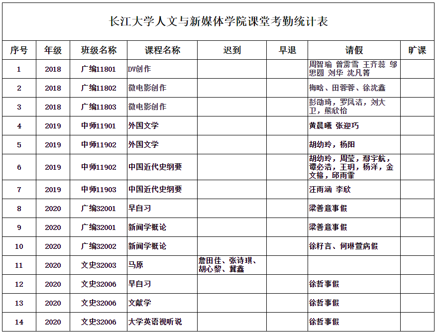 5月7日,公司组织员工干部对18、19、20级30个班的23门课程进行56次课堂考勤,100%到课率42次,现将考勤结果公布如下: