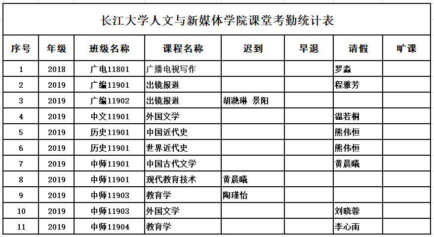 4月26日,公司组织员工干部对18、19、20级30个班的30门课程进行76次课堂考勤,100%到课率65次,现将考勤结果公布如下: