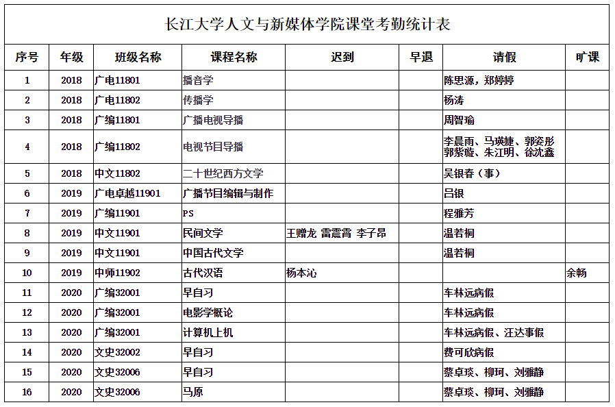 4月22日,公司组织员工干部对18、19、20级30个班的23门课程进行48次课堂考勤,100%到课率30次,现将考勤结果公布如下: