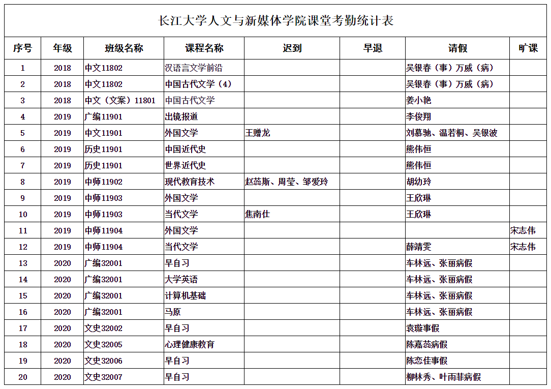 4月19日,公司组织员工干部对18、19、20级30个班的24门课程进行了67次课堂考勤,100%到课率47次,现将考勤结果公布如下: