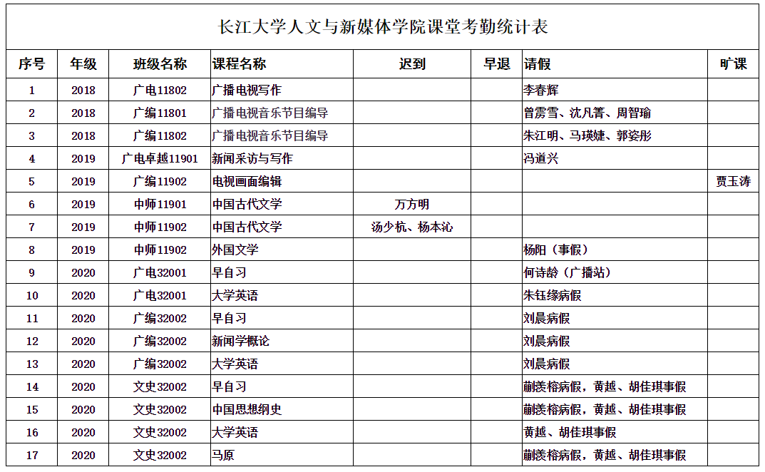 4月14日,公司组织员工干部对18、19、20级30个班的24门课程进行了68次课堂考勤,100%到课率45次,现将考勤结果公布如下: