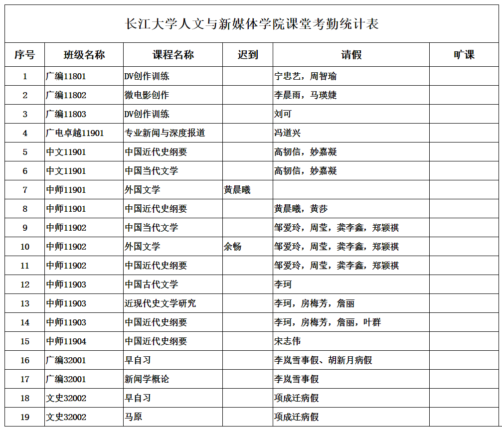 4月9日,公司组织员工干部对18、19、20级30个班的25门课程进行了61次课堂考勤,100%到课率40次,现将考勤结果公布如下: