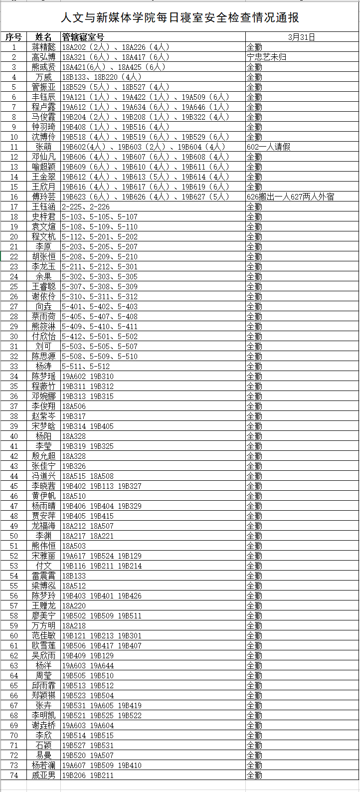 3月31日,公司组织员工干部对18、19级的宿舍进行每日寝室安全检查,现将考勤结果公布如下: