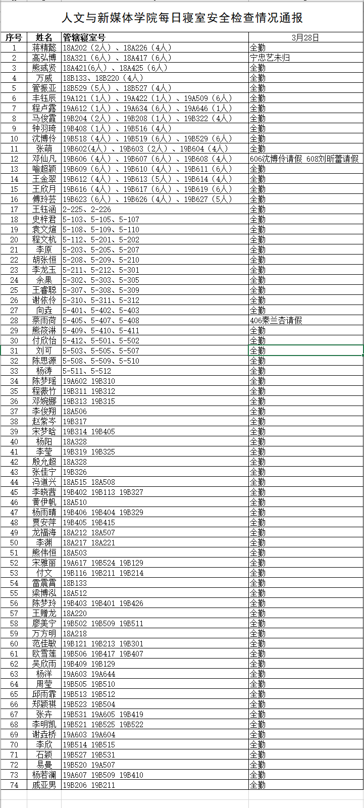 3月28日,公司组织员工干部对18、19级的宿舍进行每日寝室安全检查,现将考勤结果公布如下: