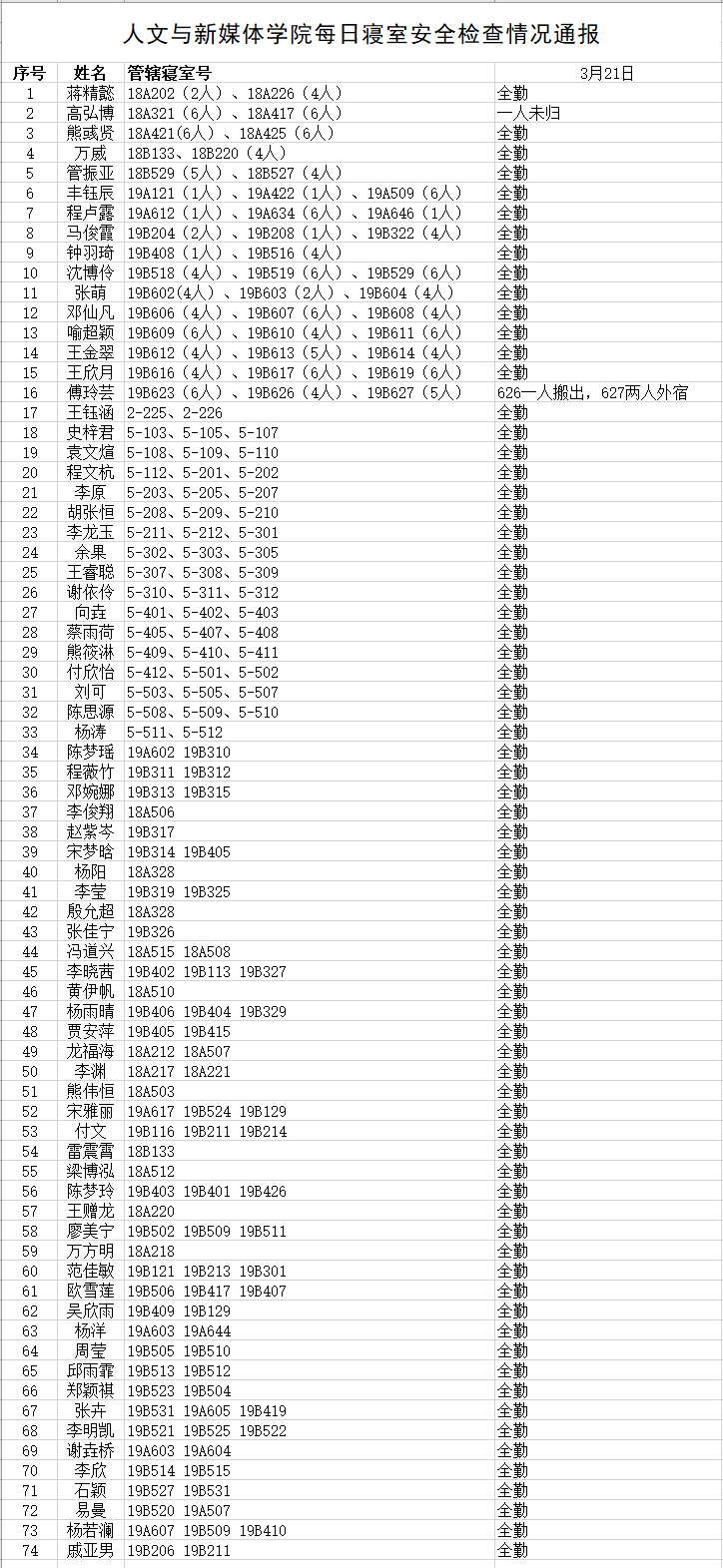 3月21日,公司组织员工干部对18、19级的宿舍进行每日寝室安全检查,现将考勤结果公布如下: