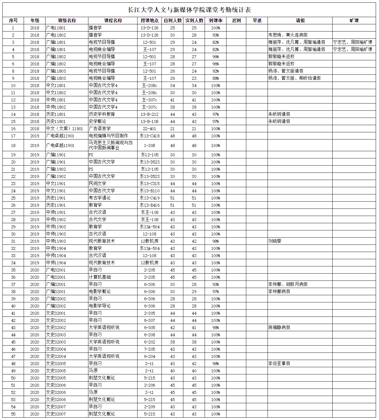 3月18日,公司组织员工干部对18、19、20级30个班的26门课程进行了52次课堂考勤,100%到课率40次,现将考勤结果公布如下: