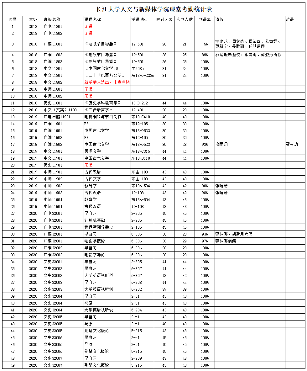3月11日,公司组织员工干部对18、19、20级30个班的20门课程进行了46次课堂考勤,100%到课率36次,现将考勤结果公布如下: