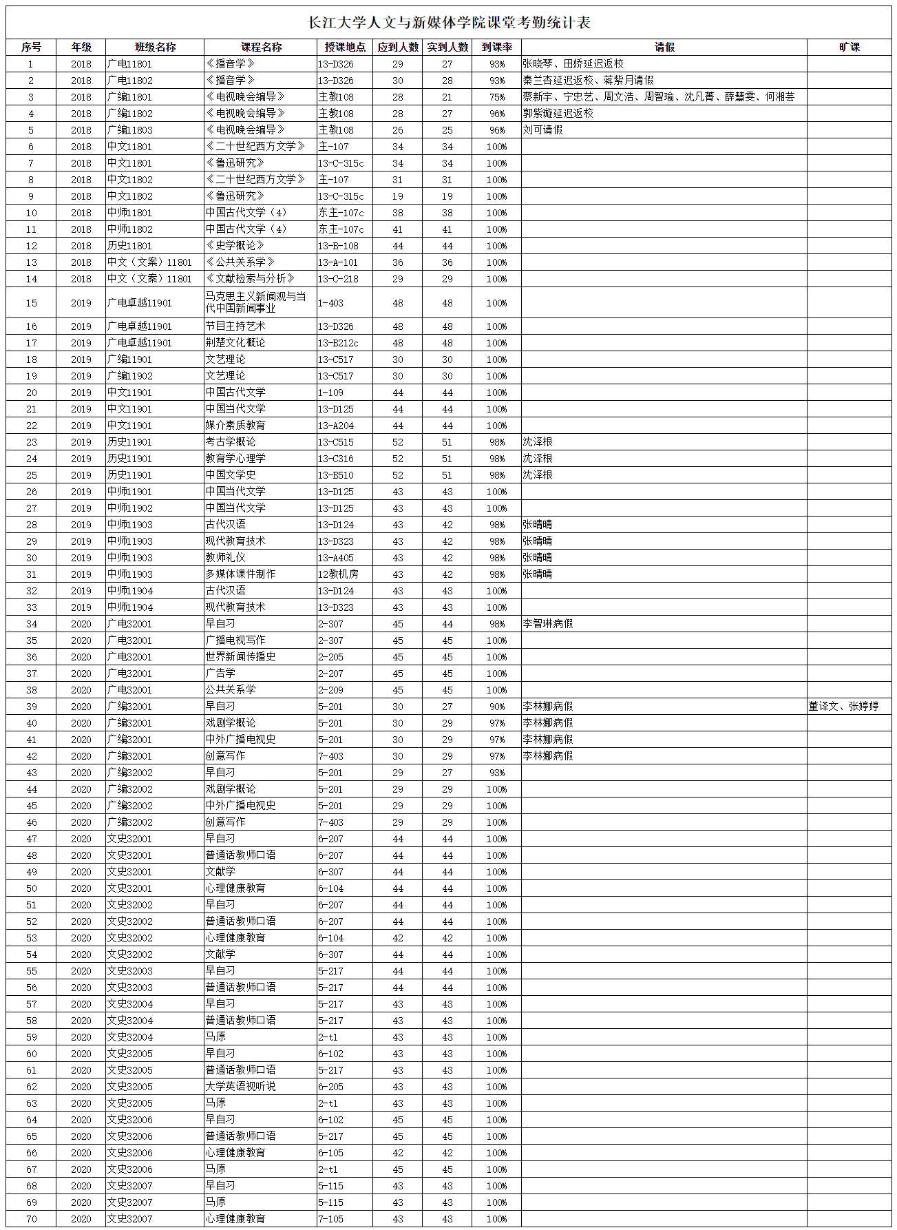 3月9日,公司组织员工干部对18、19、20级30个班的30门课程进行了70次课堂考勤,100%到课率52次,现将考勤结果公布如下: