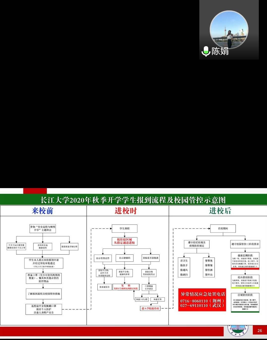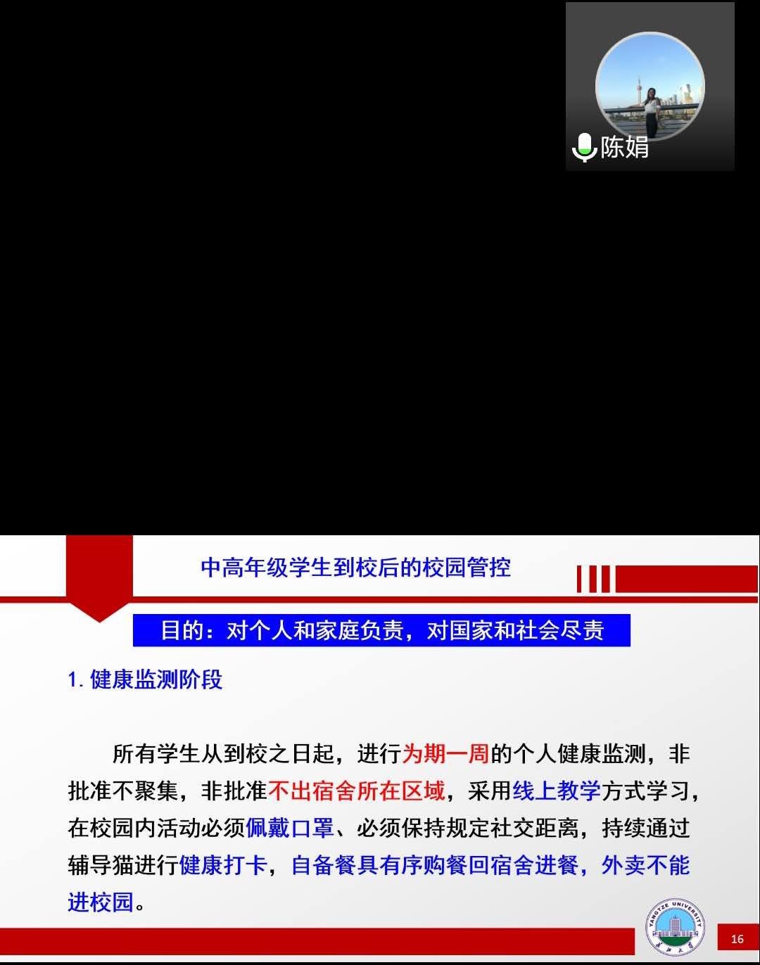 本次班会的内容主要分为员工返校前的准备、员工进校流程、员工到校后的校园管控、关注心理健康、学费缴纳与注册和学业规划六个部分,重点强调了开学前的各类注意事项和到校之后的各类须知,要求同学们在报道后遵守学校各类规章制度,加强常态化防控疫情,如有特殊情况及时向辅导员老师反馈。陈娟老师在会中强调“疫情尚未过去,仍需打起十二分的精神来面对它,谨防反弹,需要我们每个同学积极参与,期待疫情之后我们可以自由在校园中漫步。”会议的最后,陈娟老师嘱咐同学们珍惜宝贵的研究生学习生涯,与同学、老师之间形成良性互动模式,积极与导师交流,同学之间相辅相成才能有更大的成就。